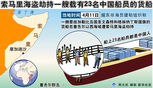 圖表:索馬里海盜劫持一艘載有23名中國(guó)船員的貨船。新華社 發(fā)