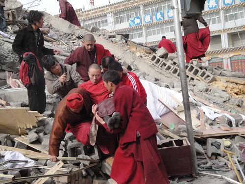 4月14日,玉樹(shù)縣結(jié)古鎮(zhèn)群眾在地震發(fā)生后的第一時(shí)間從廢墟中搶救出傷員。新華社發(fā)(張紅栓 攝)