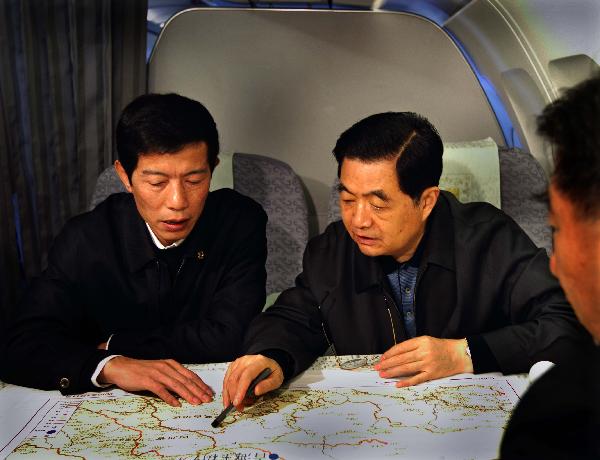 4月18日,中共中央總書記、國家主席、中央軍委主席胡錦濤乘飛機(jī)前往玉樹地震災(zāi)區(qū),看望慰問災(zāi)區(qū)干部群眾,實地指導(dǎo)抗震救災(zāi)工作。胡錦濤在飛機(jī)上察看玉樹災(zāi)區(qū)地圖(4月18日攝)。 新華社記者蘭紅光攝