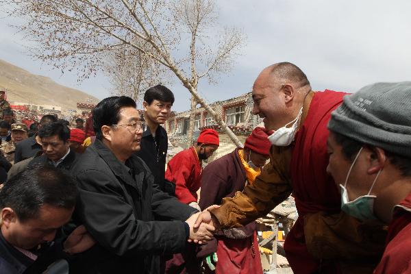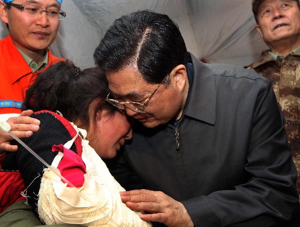 4月18日,中共中央總書記、國家主席、中央軍委主席胡錦濤親切慰問受災(zāi)群眾(4月18日攝)。 新華社記者蘭紅光攝