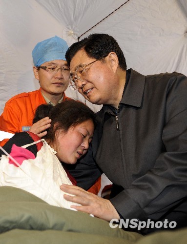 在一個(gè)醫(yī)療救治帳篷中,胡錦濤握住一位藏族受傷男子的手說,醫(yī)生們會(huì)給你提供精心的治療,你放心好了。你剛才也講了,房子沒有了,將來的生活怎么辦?中央和政府會(huì)幫助把房子蓋起來的,也會(huì)幫助重建家園。