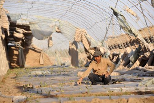 4月24日,恰特卡勒鄉(xiāng)農(nóng)民提不拉在被大風(fēng)吹毀的大棚內(nèi)查看茄苗受損情況。4月23日至24日,新疆吐魯番遭遇大風(fēng)和沙塵天氣。據(jù)吐魯番地委提供的數(shù)據(jù),目前42萬多畝農(nóng)田、1.4萬多座溫室大棚受災(zāi),當(dāng)?shù)剡出現(xiàn)因風(fēng)災(zāi)導(dǎo)致的火災(zāi)和建筑物坍塌情況。 新華社記者 江文耀 攝