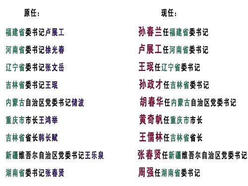 在這次人事調(diào)整中,福建省委書(shū)記孫春蘭、吉林省委書(shū)記孫政才兩名干部來(lái)自中央空降,河南省委書(shū)記盧展工、遼寧省委書(shū)記王珉、內(nèi)蒙古自治區(qū)黨委書(shū)記胡春華、新疆維吾爾自治區(qū)黨委書(shū)記張春賢四人為地方輪換。此外,湖南省委書(shū)記周強(qiáng)、重慶市市長(zhǎng)黃奇帆、吉林省省長(zhǎng)王儒林三位同志為省內(nèi)提任干部。