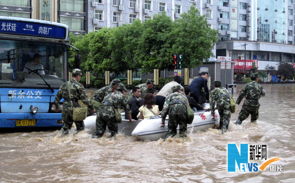 5月13日,武警官兵用沖鋒舟載著被困旅客往安全地帶轉(zhuǎn)移。當(dāng)日,江西省新余市遭遇暴雨天氣,新余市火車站積水導(dǎo)致2000余名旅客被困,武警新余市支隊官兵緊急出動,把被困旅客轉(zhuǎn)移到安全地帶。新華社發(fā)(陳開順 攝)