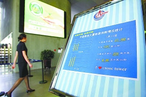 20日,中海油總部大堂豎起“每日能耗統(tǒng)計牌”,明示前一天大廈用電、用水量等信息,墻上的大屏幕則不間斷播放綠色辦公宣傳短片,這些舉措時刻提醒每一位員工節(jié)能環(huán)保。(記者童曙泉/席賀興攝 )
