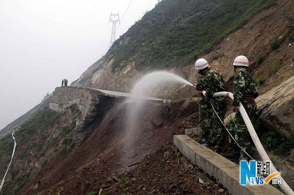 5月30日,消防官兵正在用高壓水槍為垮塌山體排險(xiǎn)。5月29日,四川省阿壩藏族羌族自治州汶川縣一處山體塌方,造成213國道汶川段徹底中斷,并有一條通村半山公路出現(xiàn)約50厘米寬的裂縫,但沒有發(fā)現(xiàn)人員傷亡。這是2008年“汶川特大地震”發(fā)生后,這條有著“震中生命線”之稱的國道第三次因山體大塌方中斷。新華社發(fā)(汶宣攝)