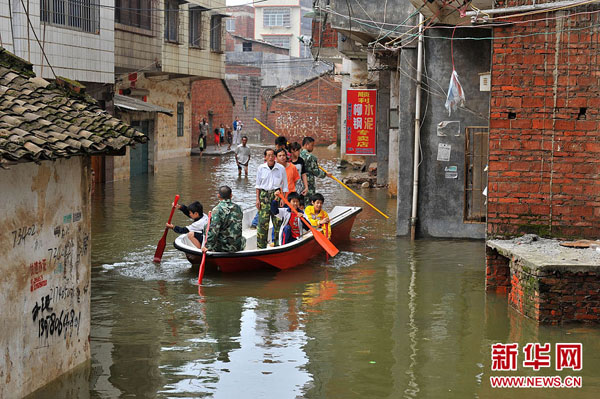 6月3日,當(dāng)?shù)馗刹咳罕娬谵D(zhuǎn)運(yùn)受困人員。遭遇歷史罕見特大暴雨后的廣西來賓市內(nèi)澇正在消減之時(shí),來賓市興賓區(qū)鎮(zhèn)東社區(qū)一個(gè)叫“凌窩”的地方,由于地勢低洼,內(nèi)澇不減反增,積水最深處達(dá)到5至6米,有388戶1700多人被水圍困。當(dāng)日已是水困“凌窩”的第三天,當(dāng)?shù)攸h委、政府正在全力排澇,已組織干部群眾和人民子弟兵,將大部分被困群眾轉(zhuǎn)移。新華社記者 李斌 攝