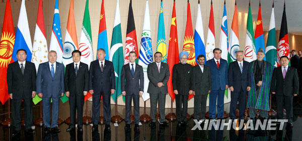 資料圖片 2009年6月16日,上海合作組織成員國元首理事會第九次會議在俄羅斯葉卡捷琳堡舉行,中國國家主席胡錦濤與其他成員國領(lǐng)導(dǎo)人出席。這是上海合作組織成員國、觀察員國領(lǐng)導(dǎo)人和主席國客人集體合影。新華社記者 龐興雷 攝