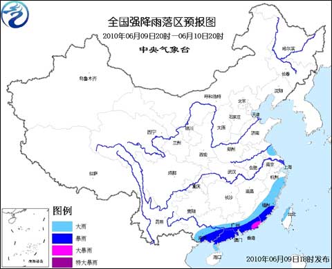 預(yù)計(jì),6月9日20時(shí)到6月10日20時(shí),江蘇東部、浙江南部、福建大部、廣東大部、廣西中南部、臺(tái)灣西北部等地有大雨,其中,福建南部、廣東中南部、廣西東南部等地有暴雨,局部有大暴雨;上述部分地區(qū)還將伴有短時(shí)雷雨大風(fēng)等強(qiáng)對(duì)流天氣。