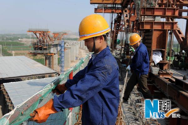 5月1日,工人在京滬高鐵跨津浦鐵路特大橋工地。新華社記者范長(zhǎng)國(guó)攝