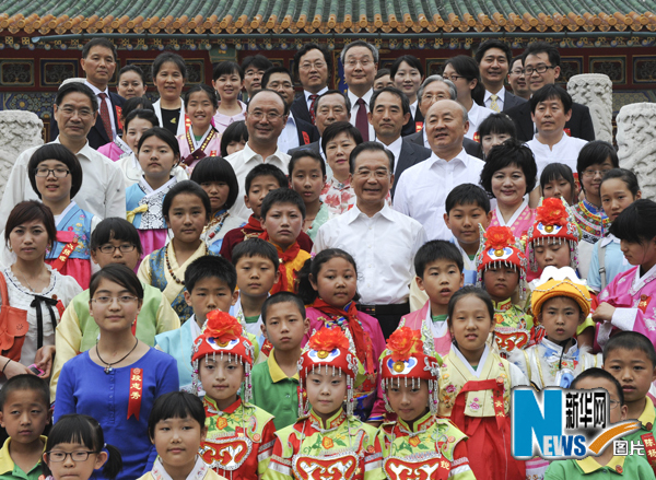 6月11日下午15時(shí)許,中南海紫光閣前,一群身著鮮艷民族服裝的中韓兩國少年兒童,歡呼雀躍地?fù)硐驀鴦?wù)院總理溫家寶,緊緊圍在他身邊。