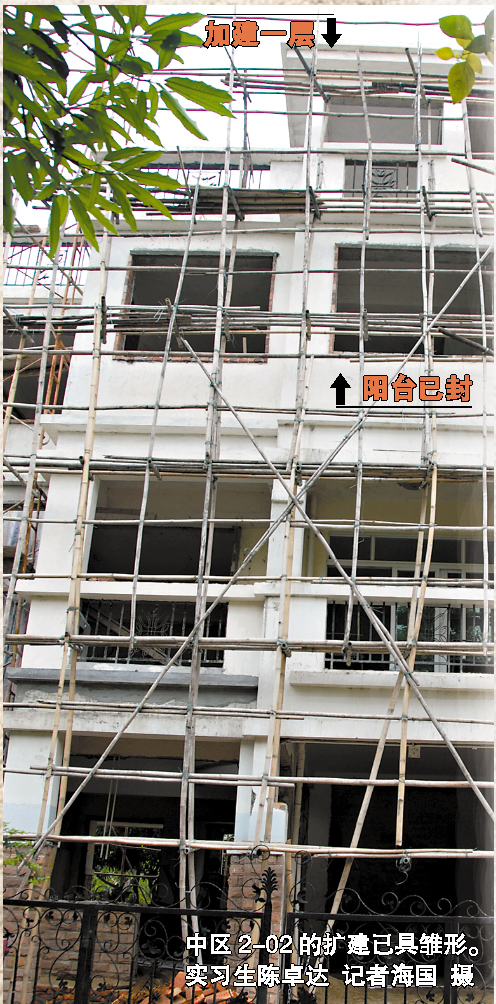 昨日(12日)上午,記者來到南浦海濱花園探營,發(fā)現(xiàn)3幢別墅的外墻正搭著腳手架。從施工情況來看,中區(qū)2-02別墅擴建的別墅已現(xiàn)雛形,不僅比周圍的別墅高出一層,外面還凸建出一段。記者走進去一看,原來2層的天臺已向外凸建并被封閉成房間,小陽臺也被封閉起來,多建的樓梯通向3層天臺。“改建后,多了50多平方米”,現(xiàn)場的施工人員說,改建工期大約要4個月,記者看到墻上還張貼著物管公司的裝修許可證。