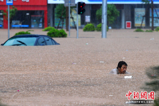 6月9日,廣西重點(diǎn)防洪城市梧州遭遇了四年來最嚴(yán)重的一次內(nèi)澇,導(dǎo)致梧州新興二路兩廣市場(chǎng)加油站附近路段交通全部癱瘓。在兩廣市場(chǎng)附近,多輛汽車被困于水中。圖為一被困市民游水逃生。 中新社發(fā) 何鎏 攝
