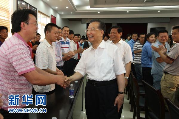 6月14日,在中華民族傳統(tǒng)佳節(jié)端午節(jié)來臨之際,中共中央政治局常委、國務(wù)院總理溫家寶先后來到北京市兒童福利院、西城區(qū)富國里社區(qū)、地鐵6號線平安里站施工工地,看望孤殘兒童和城市低保戶,了解農(nóng)貿(mào)市場蔬菜供應(yīng)和價(jià)格情況,召開新一代農(nóng)民工座談會。這是溫家寶在北京地鐵6號線平安里站施工工地會議室召開新一代農(nóng)民工代表座談會。新華社記者姚大偉攝