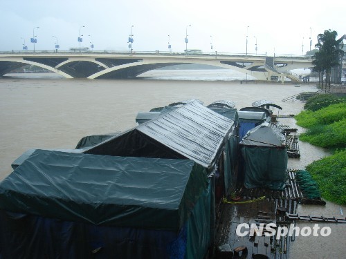 6月17日8時20分,桂林市氣象局發(fā)布暴雨紅色預警信號:桂林市區(qū)預計3小時雨量將達100毫米以上,且降雨可能持續(xù)。10時39分,桂林市區(qū)段漓江水位達到146米,超過警戒水位0.3米,預計下午16時,漓江水位將達到147.2米。圖為停靠在桂林市解放橋下的魚船。 中新社發(fā) 歐惠蘭 攝