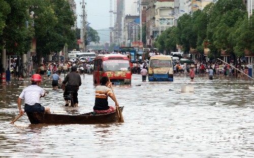 6月20日,江西省東鄉(xiāng)縣遭遇嚴重洪澇災(zāi)害。自18日20:00至19日17:00時,東鄉(xiāng)縣平均降雨量達256毫米,居江西省之最,其中6個鄉(xiāng)鎮(zhèn)降雨量都在200毫米以上,王橋鎮(zhèn)最高達343毫米,東鄉(xiāng)縣主城區(qū)三分之二面積受淹。 中新社發(fā) 朱文標 攝