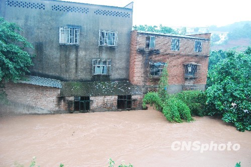 近日,持續(xù)的暴雨使四川瀘州、涼山等部分地方受災(zāi)。圖為瀘州轄區(qū)內(nèi)的溪流逼近民房。 中新社發(fā) 周羽誼 攝