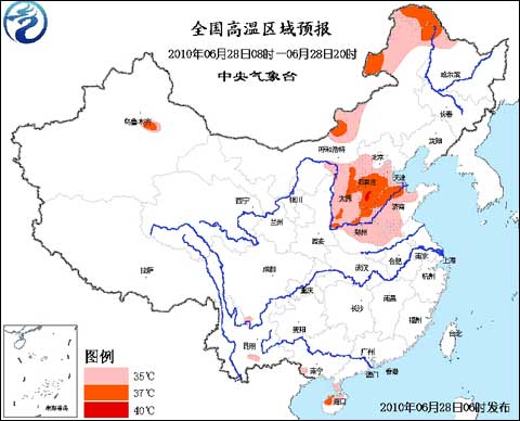 中央氣象臺(tái)2010年6月28日06時(shí)繼續(xù)發(fā)布高溫藍(lán)色預(yù)警:預(yù)計(jì),今天白天,內(nèi)蒙古東北部和中部的部分地區(qū)、黑龍江西北部、山西、河北大部、天津、河南中北部、山東中西部、安徽北部、江蘇西北部、廣東雷州半島、海南北部等地有35~37℃、局地38℃的高溫天氣,其中,河北南部的局部地區(qū)最高氣溫可達(dá)40℃。