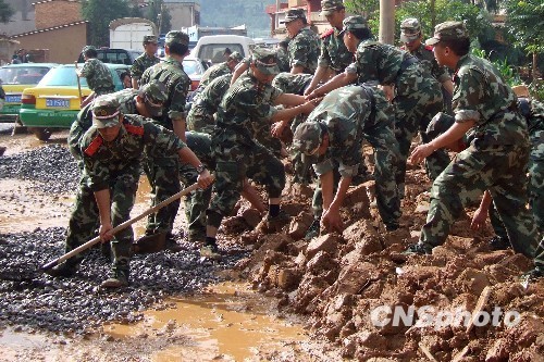 云南省曲靖市馬龍縣境內(nèi)近日突降特大暴雨,連續(xù)7個小時的強(qiáng)降雨造成該縣縣城被淹,4個鄉(xiāng)鎮(zhèn)11個村委會100多個自然村5萬多人受災(zāi),1人死亡,165人受傷,4000多人被困。武警云南總隊(duì)曲靖支隊(duì)200名官兵第一時間展開救援。圖為清理淤泥。 中新社發(fā) 陳世亮 攝