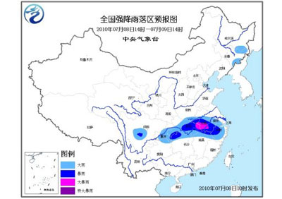 中央氣象臺7月8日10時發(fā)布暴雨黃色預警:預計,7月8日14時到7月9日14時,四川中部、重慶中東部、貴州東北部、湖北中東部和西南部、河南南部、安徽中南部、江蘇南部、浙江中西部、江西北部、湖南北部等地有大到暴雨,其中,湖北東部、安徽西南部的局部地區(qū)有大暴雨;上述部分地區(qū)并伴有短時雷雨大風等強對流天氣。