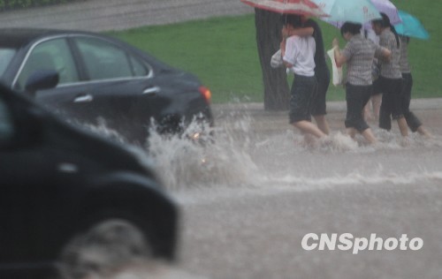 7月9日上午9時(shí)許,一場強(qiáng)降雨襲擊重慶主城,不少馬路路面很快出現(xiàn)積水。圖為幾名行人脫下鞋子卷起褲腿互相攙扶過馬路猶如過河。中新社發(fā) 郭晉嘉 攝