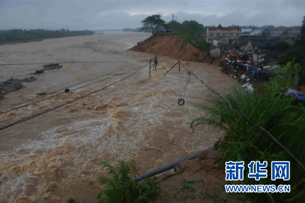 安徽省桐城市大沙河青草段發(fā)生崩岸的現(xiàn)場(chǎng)(2010年7月11日攝)。連日來,安徽桐城市遭受歷史罕見的特大暴雨襲擊。11日上午10時(shí),桐城市大沙河青草段發(fā)生決堤,武警安慶市支隊(duì)110名官兵火速趕赴現(xiàn)場(chǎng),努力填堵缺口。新華社發(fā)(廖福安 攝)