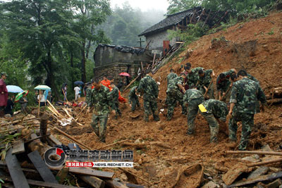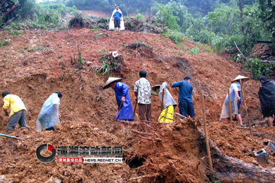 由于通往事發(fā)現(xiàn)場(chǎng)的道路被水沖斷,導(dǎo)致大型挖掘機(jī)械短時(shí)間內(nèi)無(wú)法達(dá)到現(xiàn)場(chǎng),現(xiàn)場(chǎng)一度采用人工挖掘。12日下午3點(diǎn)左右,3名遇難村民被挖出。到下午5點(diǎn)多,當(dāng)?shù)卣o急調(diào)運(yùn)一臺(tái)大型挖機(jī)趕到現(xiàn)場(chǎng)進(jìn)行挖掘。13日早上8點(diǎn)20分左右,另外3名遇難者遺體也被找到。
