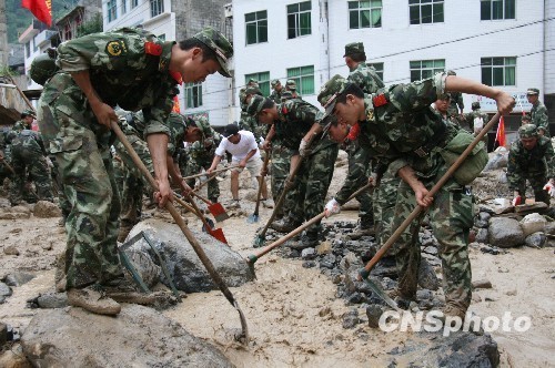 云南省昭通市巧家縣小河鎮(zhèn)鎮(zhèn)政府所在地近日因遭受暴風(fēng)雨襲擊,引發(fā)特大滑坡泥石流災(zāi)害。圖為駐地的武警云南總隊(duì)昭通支隊(duì)150名官兵第一時(shí)間趕赴現(xiàn)場(chǎng)參與搶險(xiǎn)救災(zāi)。 中新社發(fā) 謝學(xué)浩 攝