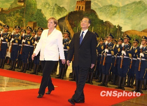 7月16日上午,中國國務院總理溫家寶在北京人民大會堂舉行儀式歡迎德國總理默克爾訪華。 中新社發(fā) 任晨鳴 攝