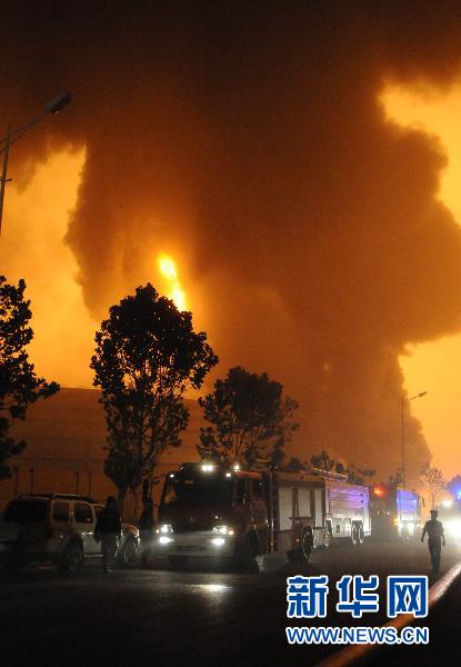 消防官兵在爆炸現(xiàn)場滅火(7月16日攝)。 7月16日晚18時許,大連市大連新港附近中石油的一條輸油管道發(fā)生爆炸起火。到當(dāng)晚23時30分記者發(fā)稿時,火勢得到初步控制。 新華社記者蔡擁軍 攝