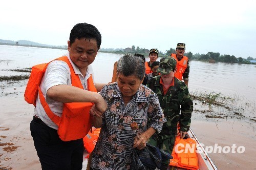 連日暴雨和過境洪峰造成重慶潼南近十萬(wàn)人受災(zāi),其中潼南柏梓四個(gè)村被洪水圍成“孤島”,400村民被困。18日,救援人員將被困群眾陸續(xù)轉(zhuǎn)移到安全地帶。 中新社發(fā) 曹多然 攝