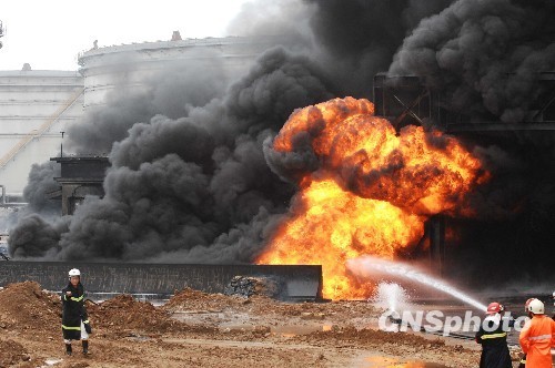 7月17日,消防隊(duì)員在火災(zāi)現(xiàn)場(chǎng)撲火。當(dāng)日10時(shí),大連市政府召開新聞發(fā)布會(huì),宣布大連新港輸油管道爆炸現(xiàn)場(chǎng)儲(chǔ)油罐的所有閥門全部關(guān)閉,火勢(shì)基本撲滅,事故未造成人員傷亡。16日18時(shí)許,大連新港附近中石油的一條輸油管道發(fā)生爆炸起火。起火管道為直徑900毫米的原油儲(chǔ)罐陸地輸油管線,后引起700毫米管線起火,油罐沒有起火。燃燒產(chǎn)生氣體主要為含硫和芳烴類氣體,無劇毒。 中新社發(fā) 劉德斌 攝