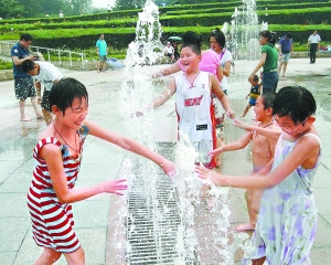 18日,在北京植物園噴泉廣場(chǎng),孩子們?cè)诒M情戲水,享受夏日里的清涼。李繼輝攝(圖片來(lái)源:北京日?qǐng)?bào))
