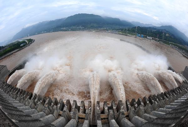 7月19日下午,三峽大壩開(kāi)啟7個(gè)泄洪深孔和2個(gè)排漂孔泄洪。 7月19日至20日上午,三峽水庫(kù)將迎來(lái)峰值接近每秒7萬(wàn)立方米的洪水,是三峽工程建成以來(lái)的最大規(guī)模的洪水。據(jù)了解,19日下午2:00,三峽庫(kù)區(qū)入庫(kù)流量已達(dá)每秒66500立方米,出庫(kù)流量達(dá)每秒38100立方米;到17:00,壩前水位147.74米。新華社記者 程敏 攝