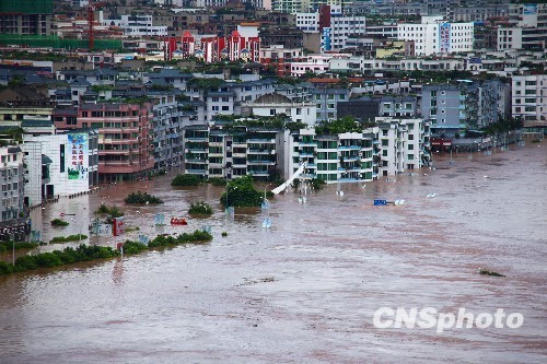 2010年7月19日下午,四川省廣安市的市民在安全地帶觀看160年來(lái)最大的洪峰通過(guò)廣安城區(qū)。 中新社發(fā) 邱海鷹 攝