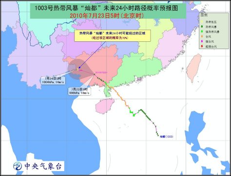 臺(tái)風(fēng)“燦都”于22日19時(shí)在廣東省西部廉江境內(nèi)減弱為強(qiáng)熱帶風(fēng)暴,20時(shí)其中心進(jìn)入廣西博白境內(nèi),隨后減弱為熱帶風(fēng)暴。23日5時(shí)熱帶風(fēng)暴“燦都”的中心位于廣西南寧市境內(nèi),就是北緯22.9度,東經(jīng)108.5度,最大風(fēng)力有8級(jí)(18米/秒),中心最低氣壓為996百帕。