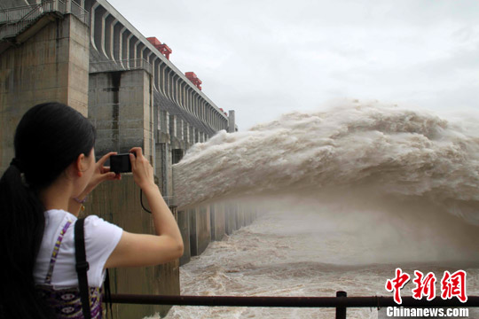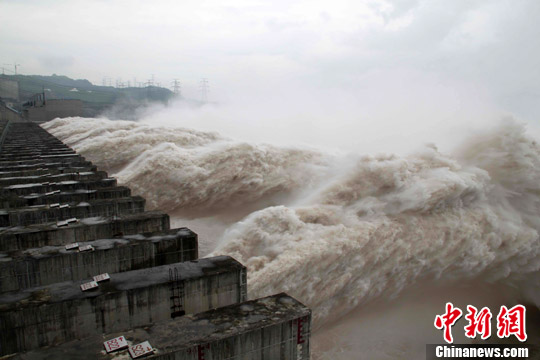 資料圖:7月20日上午,建庫以來最大洪峰抵達(dá)三峽大壩。 圖為大壩瀉洪。 劉良偉、郭曉瑩、上官純青 攝