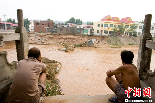 7月25日,河南西峽民眾無奈地守候在被大水沖壞的大橋旁,當(dāng)日的洪峰將西峽丹水鎮(zhèn)的大橋連根拔起,將橋面和幾十噸重的橋墩沖的無影無蹤。中新社發(fā) 王中舉 攝