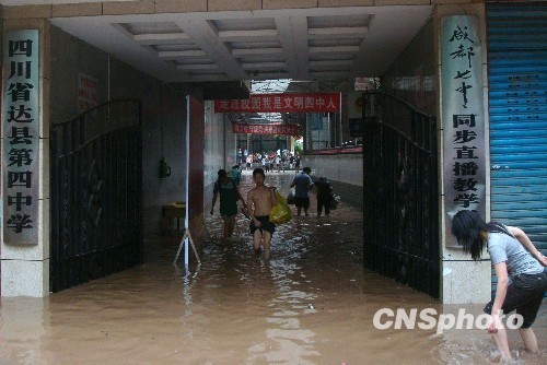 四川東部城市達(dá)州遭遇特大洪水災(zāi)害,截止18日下午,達(dá)州市7個(gè)縣(市、區(qū))263個(gè)鄉(xiāng)鎮(zhèn)不同程度受災(zāi),受災(zāi)人口超過370萬人,暴雨洪災(zāi)還造成7人死亡,23人失蹤,直接經(jīng)濟(jì)損失超過40億元。達(dá)州市氣象臺(tái)在18日下午6時(shí)發(fā)布了暴雨紅色預(yù)警信號(hào)。圖為7月18日達(dá)州市城區(qū)一中學(xué)受淹。 中新社發(fā) 胡瓏川 攝