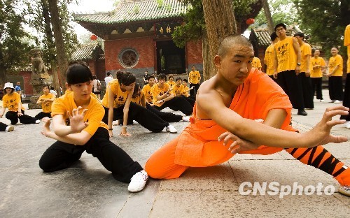 7月29日下午,河南登封,一群身著黃色功夫衫、黑色功夫褲和練功鞋的華裔青少年出現(xiàn)在少林景區(qū),他們跟著少林武僧師傅們學起了少林功夫“五步拳”。當日,前來參加“2010年海外華裔青少年中國尋根之旅”河南功夫營的美國、加拿大、英國、愛爾蘭、德國、瑞士、瑞典七個國家的50名海外華裔在少林寺拜師學藝感受中華功夫之魂。 中新社發(fā) 王中舉 攝凡注有“cnsphoto”字樣的圖片版權均屬中國新聞網(wǎng),未經(jīng)書面授權,不得轉載使用。