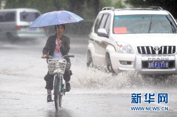 8月5日,一名市民在吉林市街頭冒雨騎行。當日,吉林省吉林市再次遭遇強降雨。大到暴雨天氣不僅給市民生活帶來不便,也使防汛抗洪工作形勢更加嚴峻。 新華社記者 徐家軍 攝