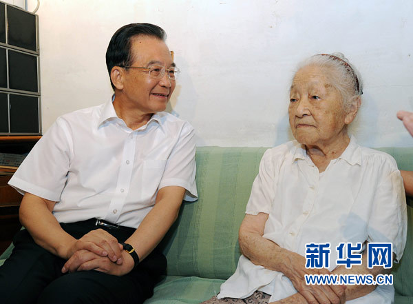 這是溫家寶在北京看望核物理學家何澤慧院士。 新華社記者 饒愛民 攝