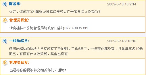 廣西壯族自治區(qū)公路管理局網(wǎng)站留言咨詢(xún)板塊的對(duì)話(截圖)