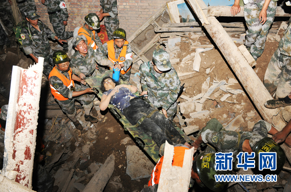 8月8日20時50分左右,蘭州軍區(qū)某防化團(tuán)官兵救出一名幸存者。甘肅舟曲縣特大山洪泥石流災(zāi)害發(fā)生后,蘭州軍區(qū)某防化團(tuán)602名官兵經(jīng)過6個多小時的急行軍到達(dá)災(zāi)區(qū),隨即展開人員搜救,截至8日20時50分共救出9名幸存者。目前,官兵們?nèi)赃B夜奮戰(zhàn)在救援一線,爭分奪秒進(jìn)行生命大營救。新華社發(fā) 張永進(jìn) 攝