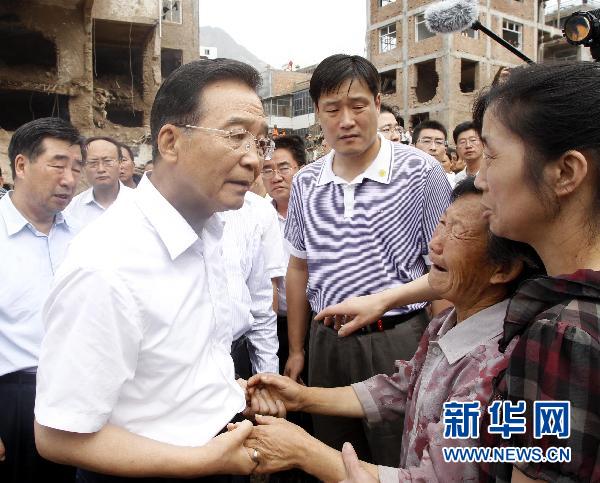 8月9日,中共中央政治局常委、國(guó)務(wù)院總理溫家寶繼續(xù)在甘肅舟曲縣特大山洪泥石流災(zāi)區(qū)察看災(zāi)情,指導(dǎo)抗洪搶險(xiǎn)救災(zāi)工作。這是溫家寶在舟曲縣災(zāi)區(qū)撫慰失去親人的群眾。新華社記者 李學(xué)仁 攝