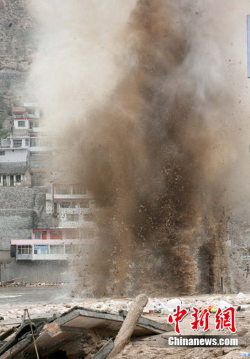8月10日,蘭州軍區(qū)某集團(tuán)軍“開山斧工兵團(tuán)”兩次對(duì)舟曲災(zāi)區(qū)堰塞湖實(shí)施爆破,雖然通過(guò)爆破,使河道基本疏通,但效果還不太明顯。11日,蘭州軍區(qū)工兵連將繼續(xù)爆破,使用炸藥重量也將提高。中新社發(fā) 劉忠俊 攝