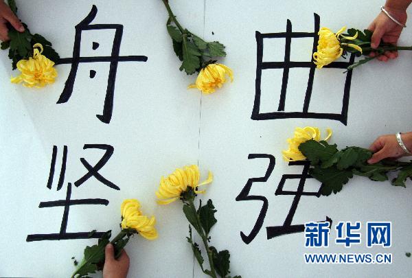 8月14日,山東郯城縣新愛嬰幼兒園的孩子們?yōu)橹矍鲭y同胞獻上黃菊,寄托哀思。當日,郯城縣新愛嬰幼兒園開展“情系舟曲大愛無疆”祈福活動,哀悼甘肅舟曲特大山洪泥石流遇難同胞,并為災區(qū)祈福。新華社發(fā)(張春雷 攝)