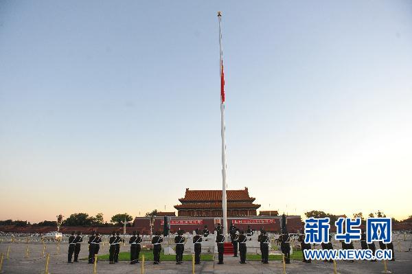 8月15日,北京天安門廣場舉行下半旗儀式。為表達全國各族人民對甘肅舟曲特大山洪泥石流遇難同胞的深切哀悼,國務院決定,2010年8月15日舉行全國哀悼活動,全國和駐外使領館下半旗志哀,停止公共娛樂活動。新華社記者羅曉光攝