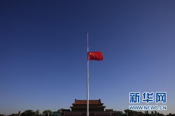 8月15日,北京天安門廣場降下半旗,向甘肅舟曲特大山洪泥石流遇難同胞志哀。 新華社記者 任正來 攝