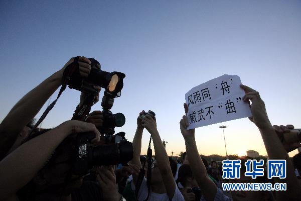8月15日,北京天安門廣場降下半旗,向甘肅舟曲特大山洪泥石流遇難同胞志哀。這是一名男青年在天安門廣場手持寫有風(fēng)雨同“舟” 威武不“曲”的紙張。 新華社記者 任正來 攝